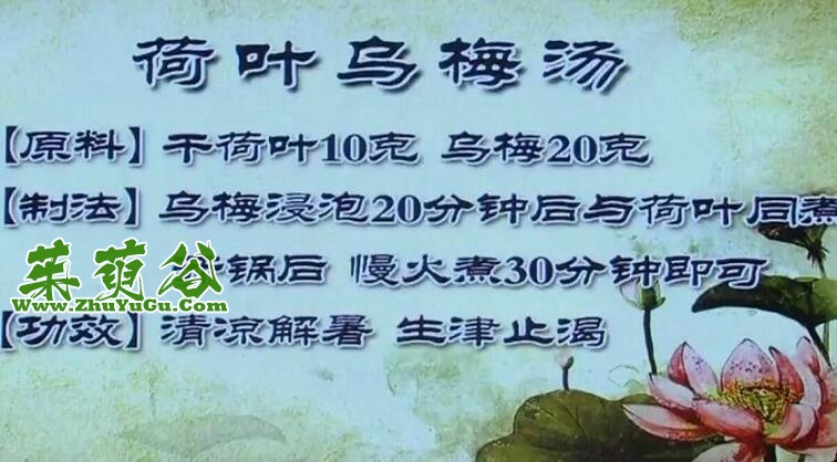 如果说中暑了又伤阴了这个时候,就不单纯的只是清热,还要滋阴了 这样就可以加上一个搭配起到滋阴的作用 荷叶,乌梅大家都比较熟悉,望梅止渴这个是酸甜的 在中医的观点里,酸甜搭配在一起就能够化阴,也叫酸酐化阴 平时一想到酸的甜的东西都会有一点生津的感觉 有的人天热喝水特别多,矿泉水一天...